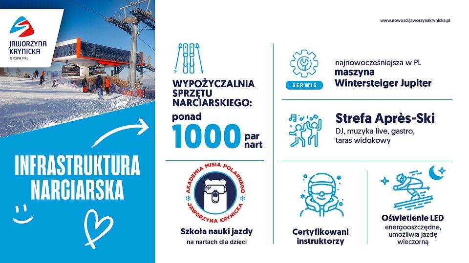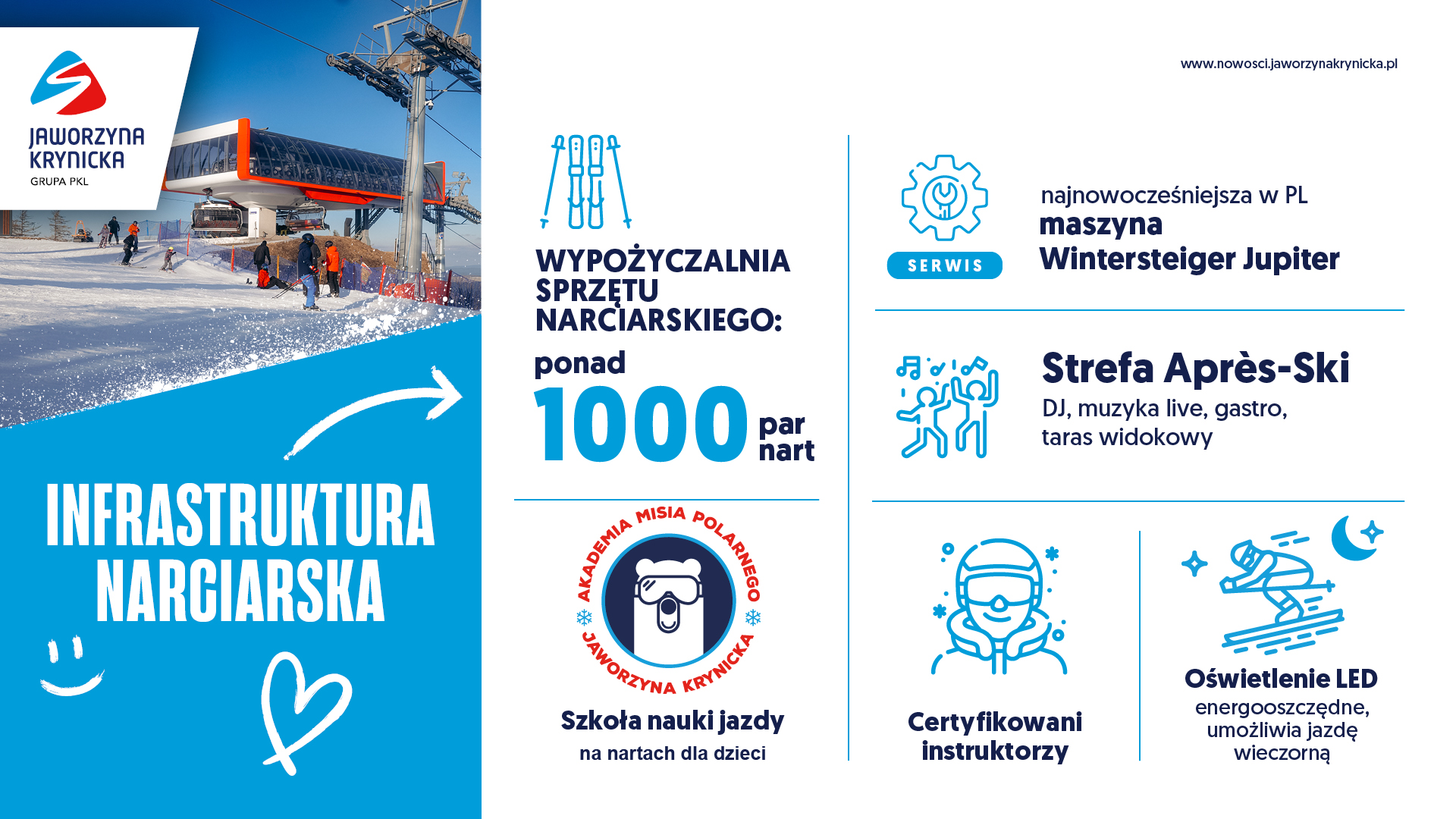 Pierwsi narciarze zawitali już tej zimy na Jaworzynę Krynicką. Ośrodek Grupy PKL, jeden z największych w Polsce, udostępnił pierwsze trasy dla narciarzy i snowboardzistów jeszcze pod koniec listopada. To właśnie na Jaworzynie Krynickiej w weekend 13-14 grudnia odbędzie się ogólnopolskie otwarcie sezonu narciarskiego! Organizatorzy zaplanowali szereg atrakcyjnych wydarzeń nie tylko na stoku, ale i w Zimowym Miasteczku przy tarasie après-ski. Ośrodek przygotował szereg nowości na ten sezon narciarski – w tym przede wszystkim supernowoczesną kolej krzesełkową Harnaś Express na popularnej trasie nr 2. Tuż obok, bo na trasie 2A na przełomie lutego i marca odbędzie się Puchar Świata FIS w snowboardzie alpejskim.